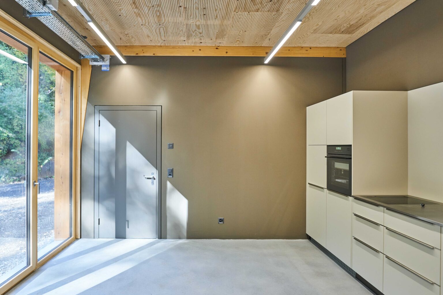 Der zweigeschossige Bau bietet im Erdgeschoss zwei grosse Werkhallen sowie einen Sozialbereich mit Duschen, Garderoben und Küche. Das Obergeschoss ist als stützenfreier Openspace gestaltet und umfasst Flächen für Archiv, Büroarbeit, Besprechungen sowie einen Pausenbereich mit Teeküche.